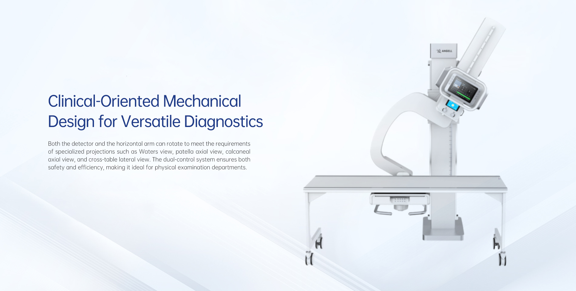 Tanto o detector quanto o braço horizontal podem girar para atender aos requisitos de projeções especializadas como a incidência de Waters, vista axial da patela, vista axial do calcâneo e vista lateral transversal. O sistema de duplo controle garante segurança e eficiência, tornando-o ideal para departamentos de exames físicos.