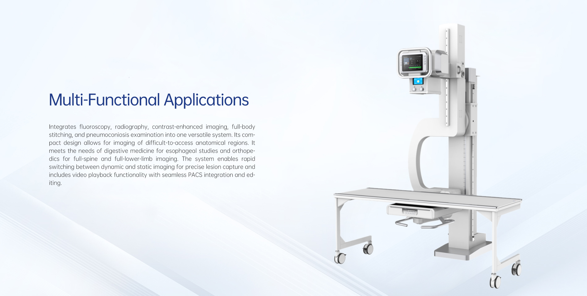 Integra fluoroscopia, radiografia, imagem com contraste, montagem corporal completa e exame de pneumoconiose em um sistema versátil. Seu design compacto permite imagear regiões anatômicas de difícil acesso. Atende às necessidades de medicina digestiva para estudos esofágicos e ortopedia para imageamento da coluna completa e membros inferiores. O sistema permite comutação rápida entre imageamento dinâmico e estático para captura precisa de lesões e inclui funcionalidade de reprodução de vídeo com integração e edição perfeitas no PACS.