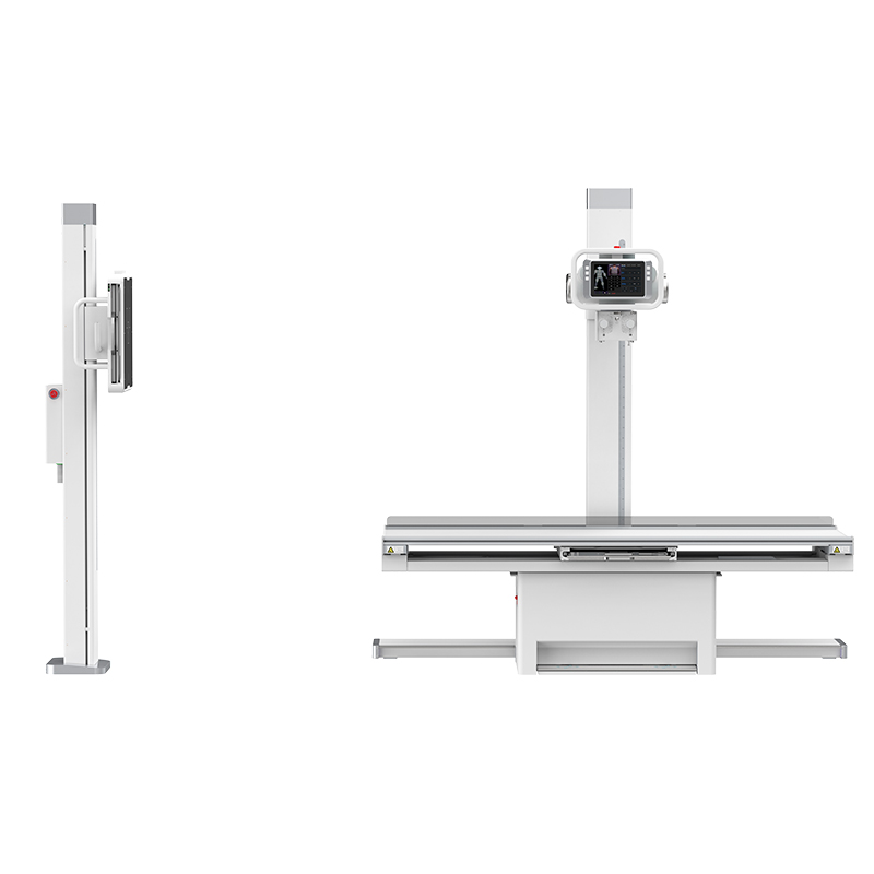 Tubo de raios X com movimento vertical elétrico que é acompanhado automaticamente pelo detector de painel plano no suporte Bucky.