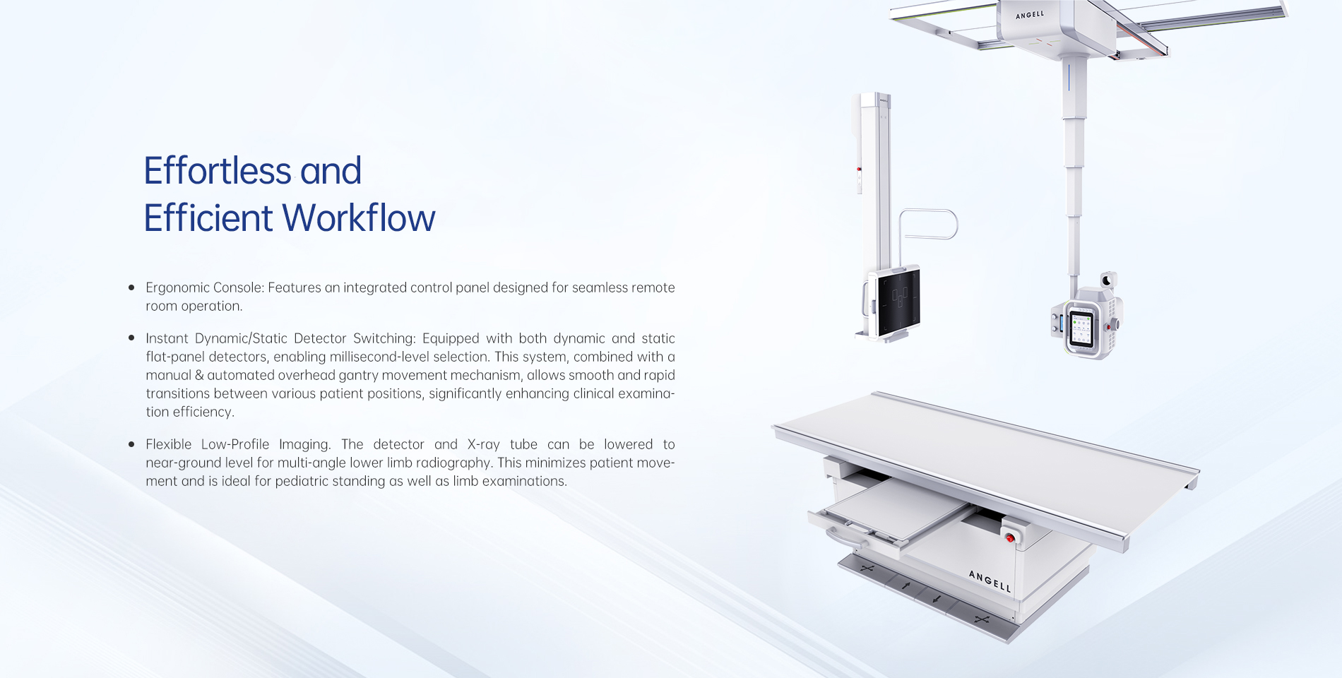 · Imageamento de Baixo Perfil Flexível: O detetor e o tubo de raios X podem ser baixados para próximo do nível do solo para radiografia de membros inferiores multiangular. Isto minimiza o movimento do paciente e é ideal para exames pediátricos em posição de pé, bem como para exames de membros.